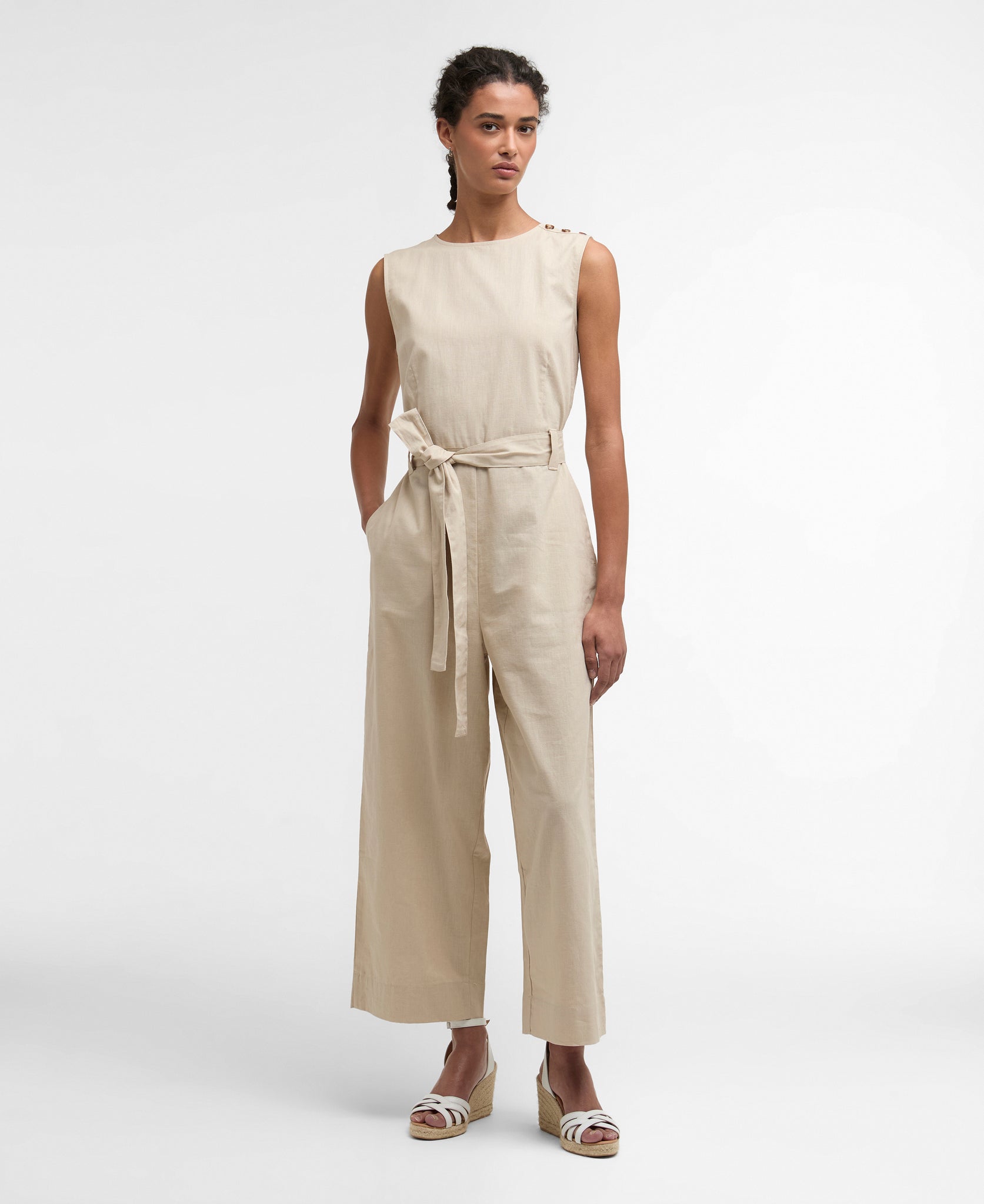 GABBY SLEEVELESS BELTED JUMPSUIT WITH BUTTON DETAIL IN MIST