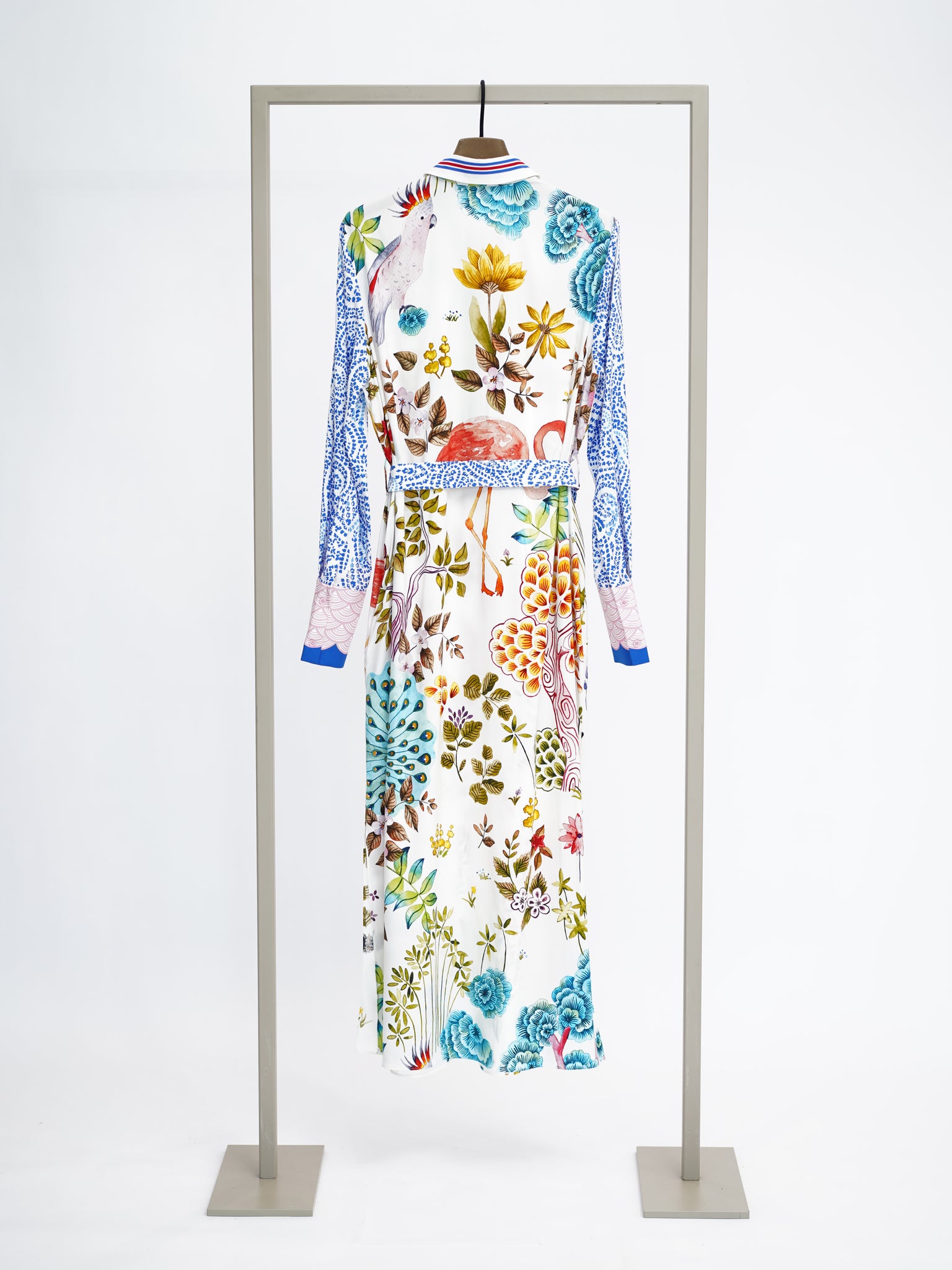 FLORAL BELTED DRESS WITH BIRD PRINT