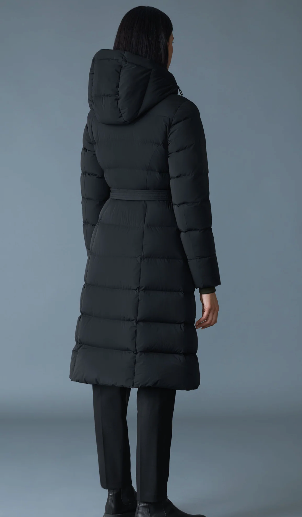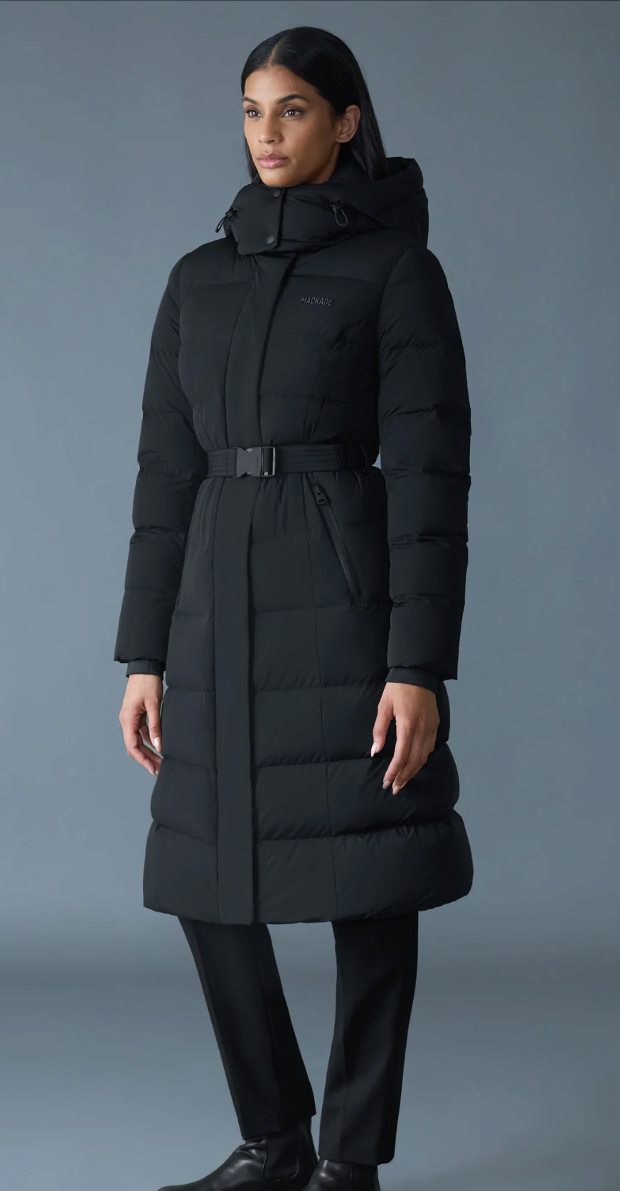 CORALIA-CITY is a fitted, long down coat engineered for cold-weather protection without the bulk. Featuring a water-resistant zipper at the center front and pockets, this streamlined silhouette includes a hood with an adjustable storm visor, insulated interior, and storm cuffs. A removable belt with buckle allows for a customizable cinch at the waist, while the recycled down fill ensures superior warmth. Finished with “MACKAGE” silicone branding on the chest for signature appeal.