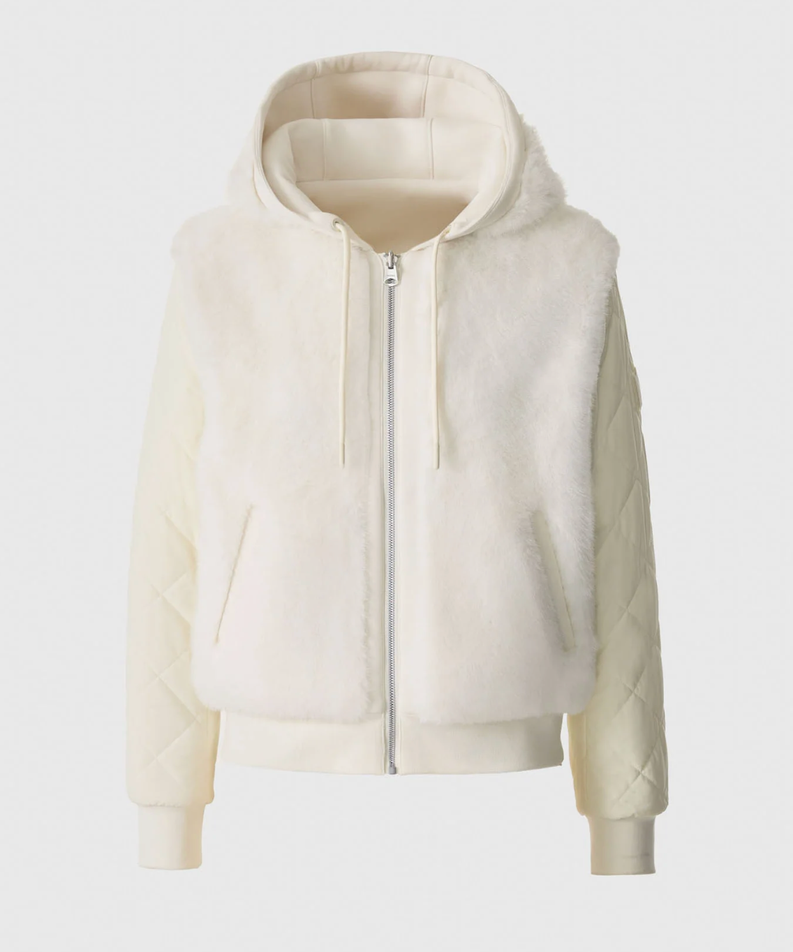 GWENDAL is a relaxed-fit reversible hoodie with a reversible design for versatile wear. One side with diamond-quilted sleeves, while the reverse shows a clean fleece finish with a branded chest logo. A full zip closure, rib knit trims, and a kangaroo pocket provide functional comfort, while faux fur and mixed media detailing add standout texture. A signature piece built for warmth and adaptability.