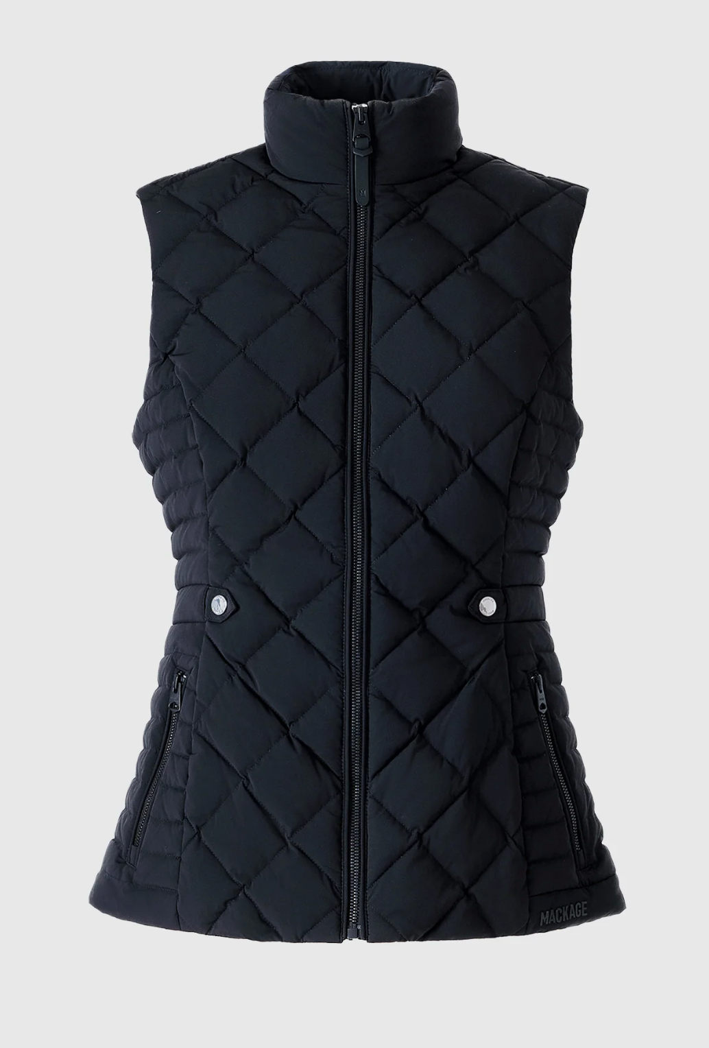 STEFANIA is a fitted diamond quilted down vest featuring a high-performance stretch shell. Crafted from stretch recycled technical fabric, it delivers lightweight warmth and structure. Design details include a center front zip closure, adjustable waist tabs with snaps for a cinched look, and a subtle silicone logo at the hem. A stand collar and piping accents finish this transitional layering piece.