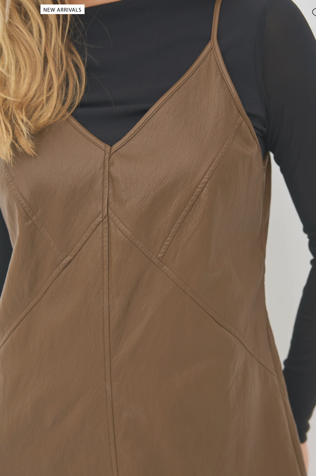 This dress combines a minimalist cut with an exclusive leather look, creating a stylish expression. It features narrow, adjustable straps and a V-neckline, providing a feminine and elegant appearance. The decorative stitches at the front subtly and flatteringly shape the silhouette.