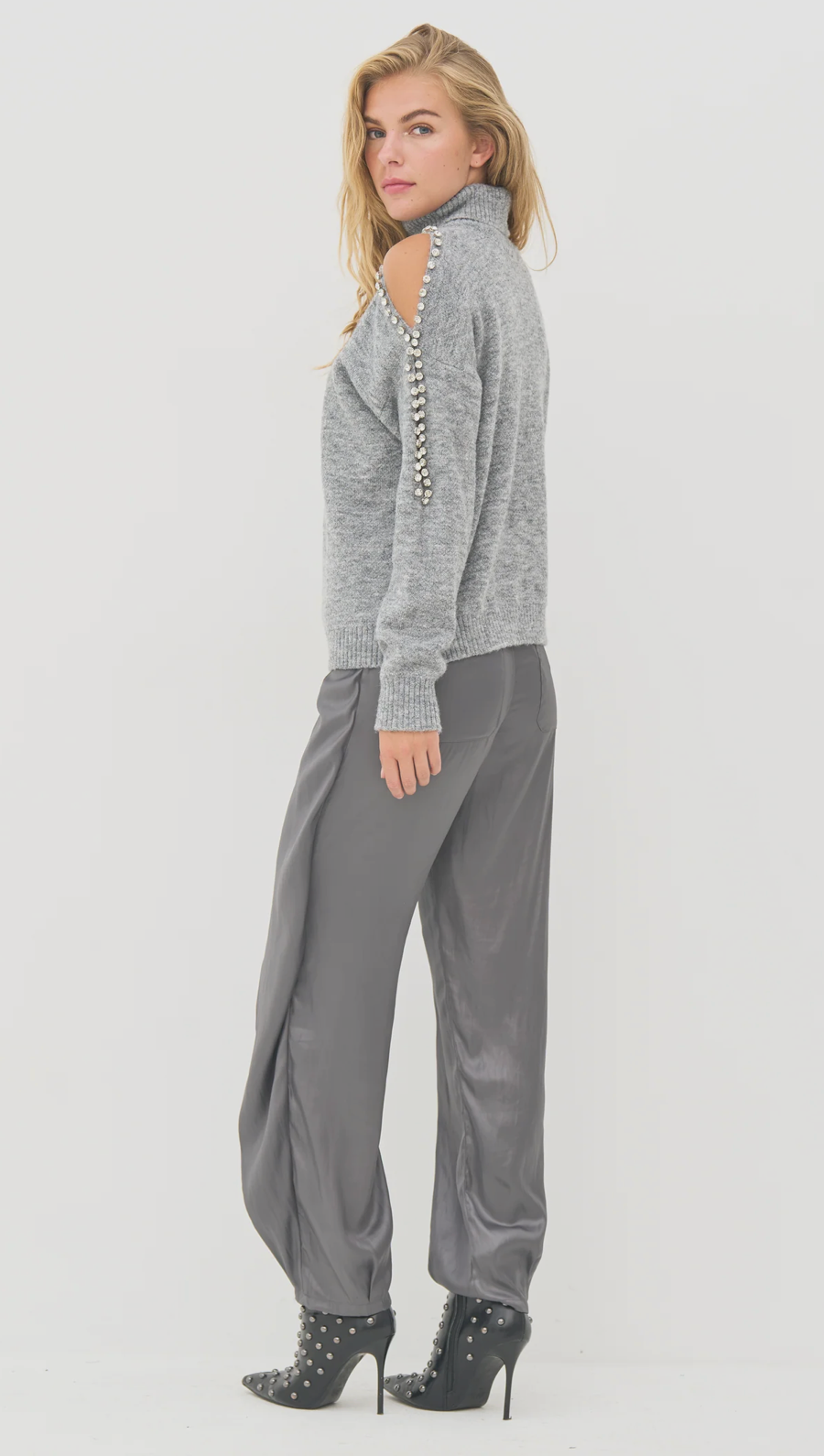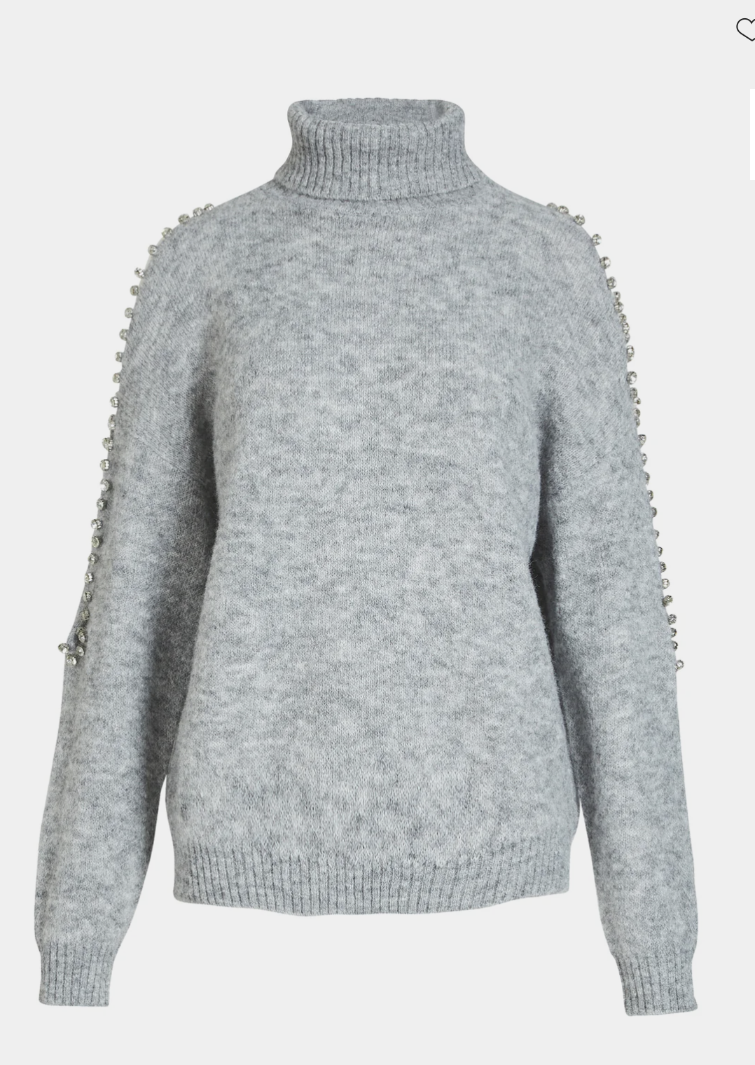 This knit blouse combines warmth and style with fine details. It features a classic turtleneck and a loose fit, making it perfect for cool days. Decorative beads are attached along the sleeves, adding a feminine and exclusive touch to the soft knit material.