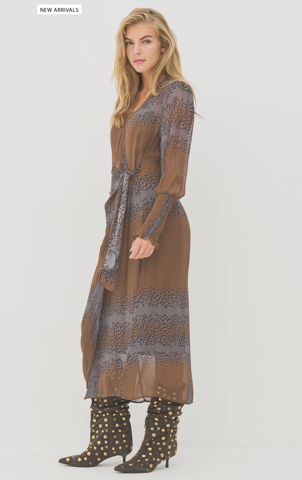 This dress combines lightness and structure with its delicate, transparent material and graphic pattern. It features a wrap-around effect with a tie at the waist and long sleeves with smocking and delicate ruffle edges, adding a feminine detail. The included slip ensures comfortable coverage.