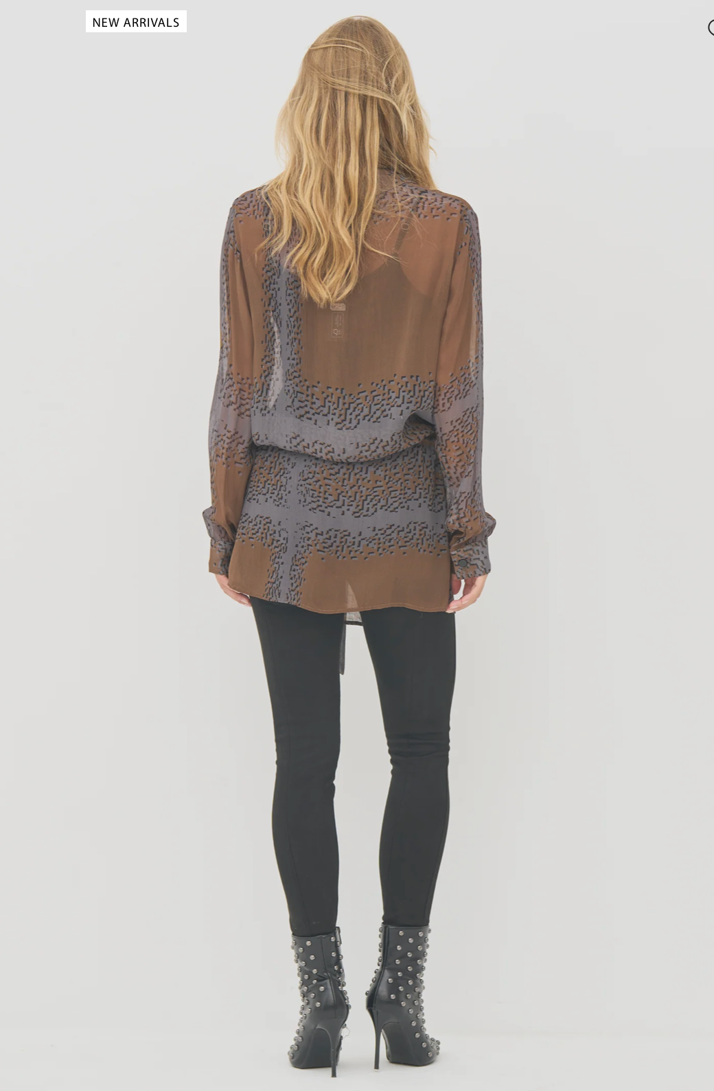Light and airy tunic with graphic print and intricate details. It features a loose fit, classic collar, and a tie belt at the waist that accentuates the figure in a relaxed manner. The fabric is slightly transparent, creating an elegant drape, while the cuffs finish the sleeves with a crisp edge.