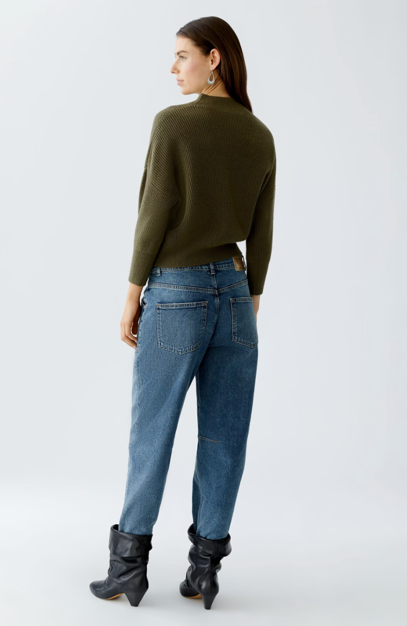 - Heavily overlapped shoulder, 7/8 sleeve with high ribbed cuff