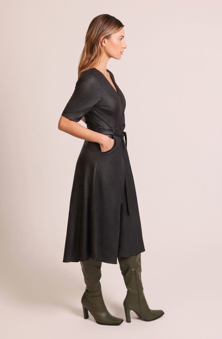 Midi dress with V neck and front self fabric popper fastening. Midi sleeves. Side pockets. Belted.