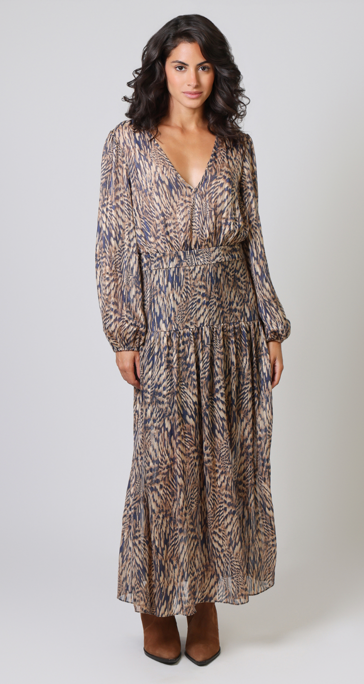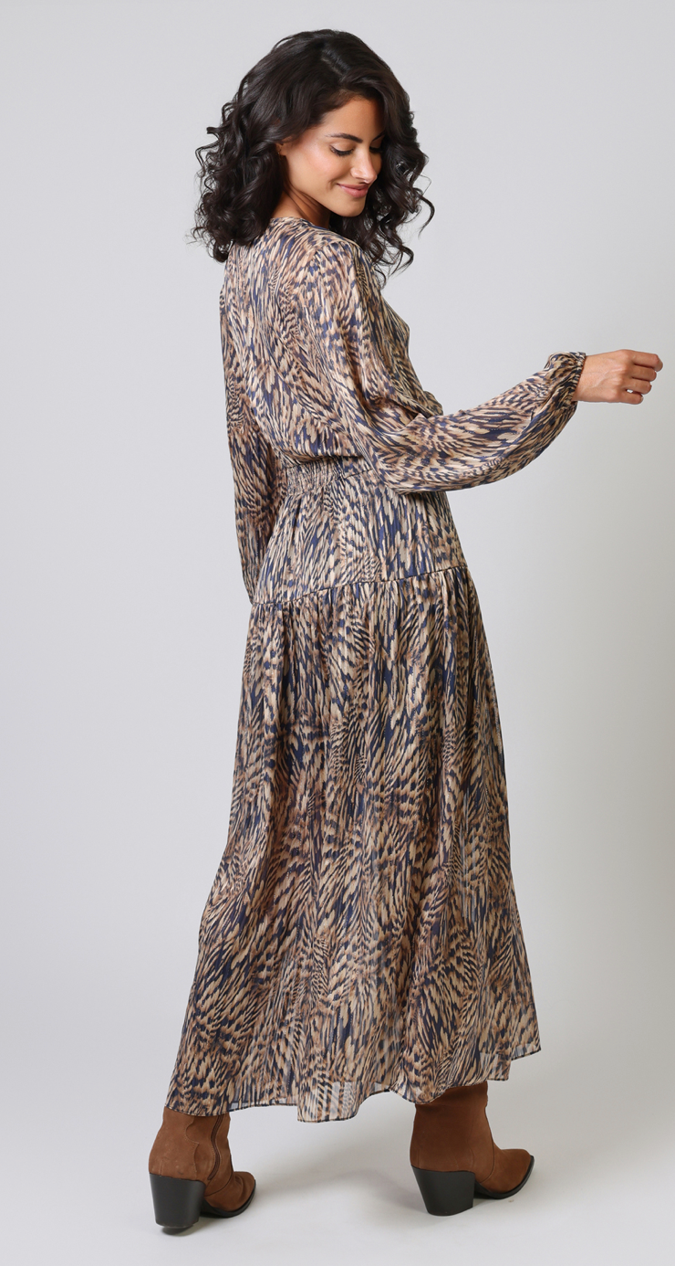 PRINTED GOLD DRESS WITH BALLOON SLEEVE IN NAVY